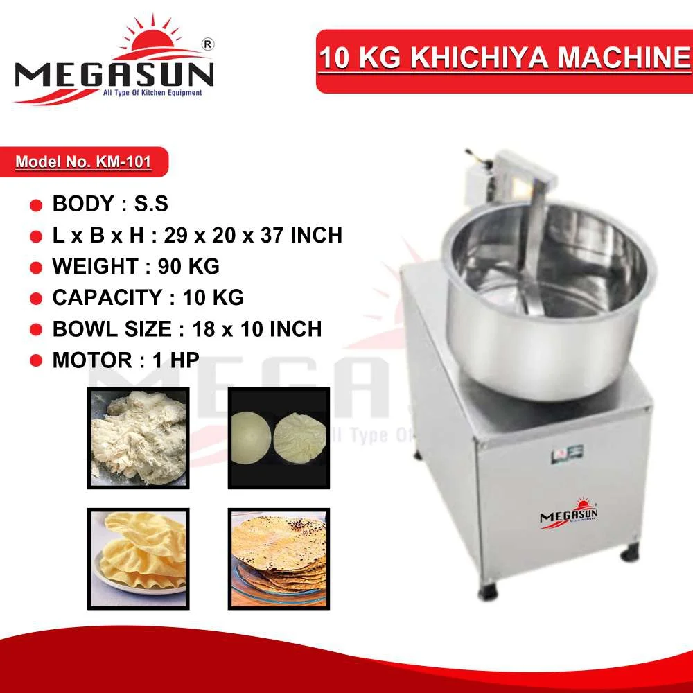 The 10 KG Khichiya Machine is designed for efficient production of khichiya, capable of processing up to 10 kg of dough at a time. This machine ensures uniformity and consistency in every batch, making it ideal for commercial kitchens and food production units. Its user-friendly design and reliable performance make it a valuable addition for high-volume khichiya preparation.