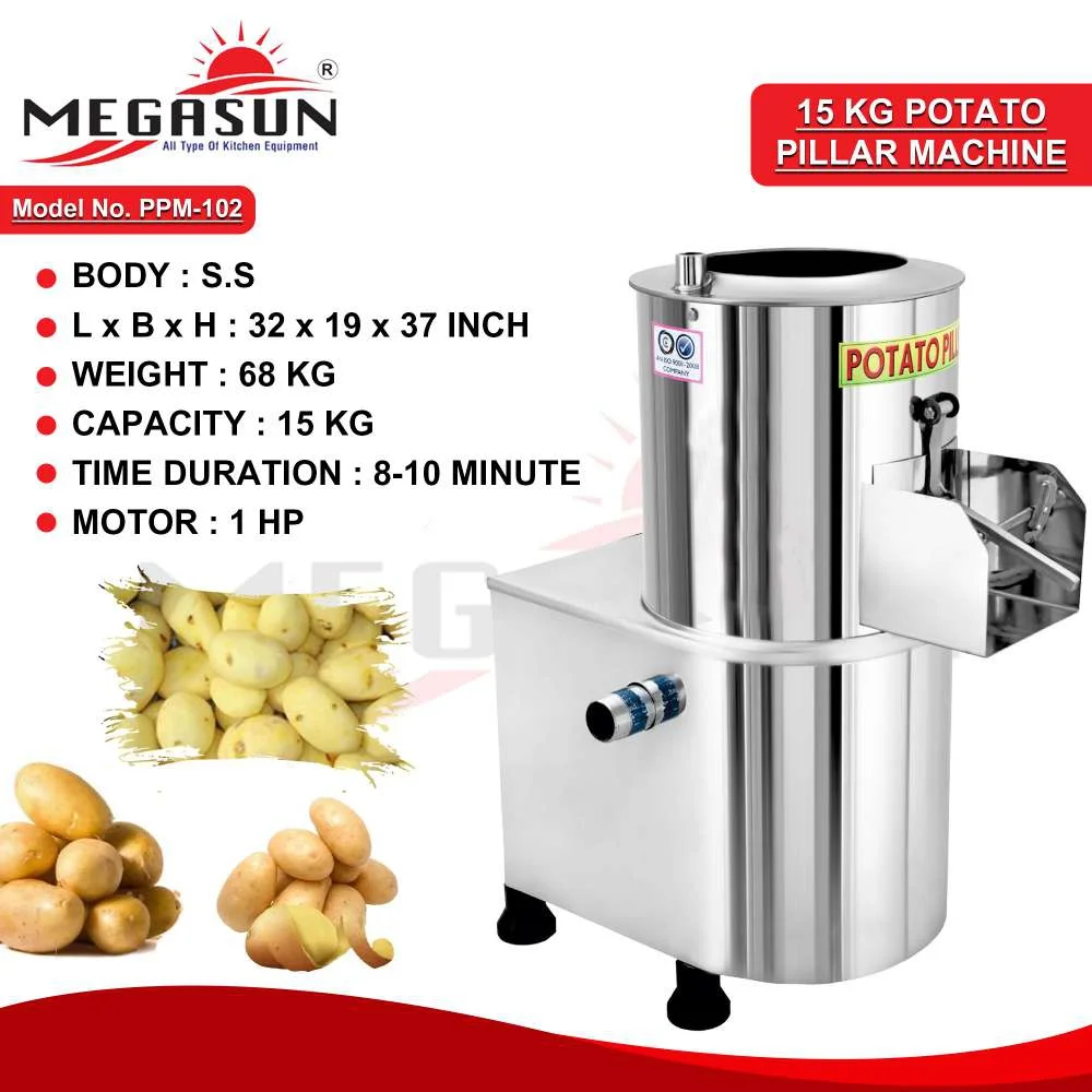 The 15 KG Potato Peeler Machine is designed for efficient peeling of up to 15 kg of potatoes. Ideal for commercial kitchens and food processing facilities, it features a robust build and high-performance motor for quick and consistent peeling. Its user-friendly design ensures ease of operation and durability.