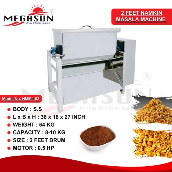 The 2 Feet Drum Size Namkeen Masala Machine is designed for efficient and uniform mixing of masala in large batches of namkeen and snacks. With a 2-foot drum size, it offers ample capacity for high-volume production. Its sturdy construction ensures durability and consistent performance, making it ideal for commercial kitchens and food processing units.