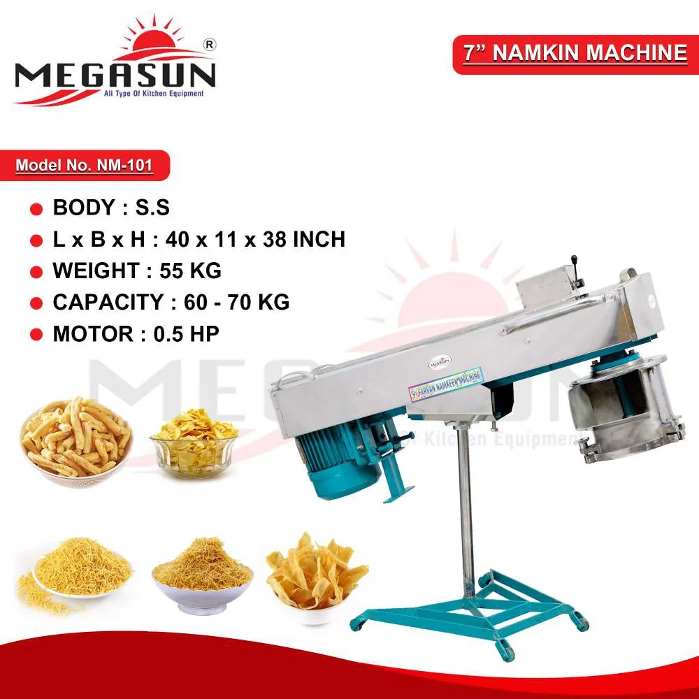 The 7 Inch Namkeen Machine is designed for efficient production of various namkeen snacks. With a 7-inch capacity, it’s ideal for small to medium-scale operations, providing consistent shaping and frying. Its compact yet durable design ensures reliable performance, making it a valuable addition to commercial kitchens and snack production units.